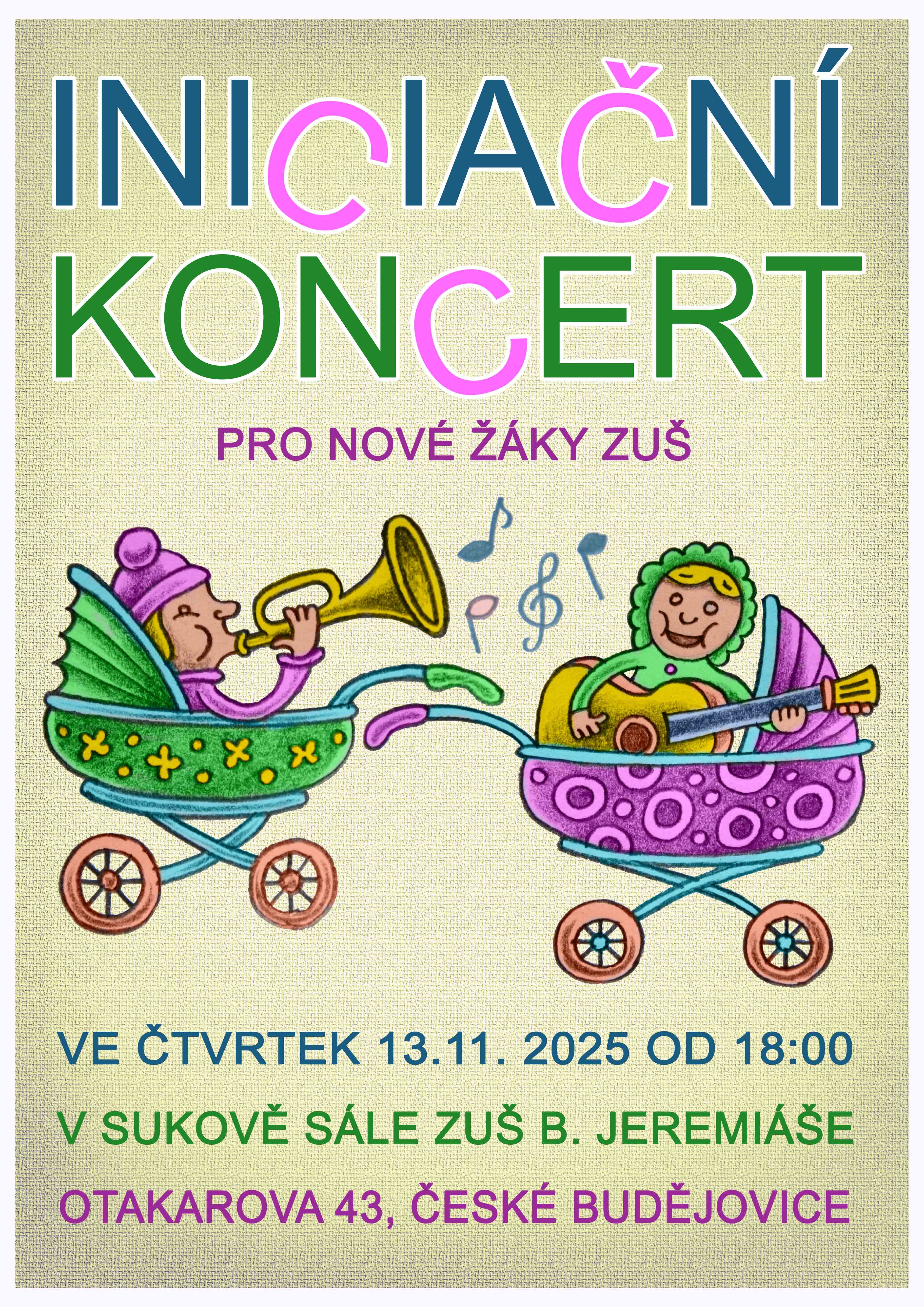 Dne 13. 11. 2025 (čtvrtek) od 18. 00 hodin se uskuteční v Sukově sále ZUŠ B. Jeremiáše Iniciační koncert pro nové žáky, na kterém se představí hudební, taneční, výtvarný i literárně dramatický obor a noví žáci obdrží malou pozornost.