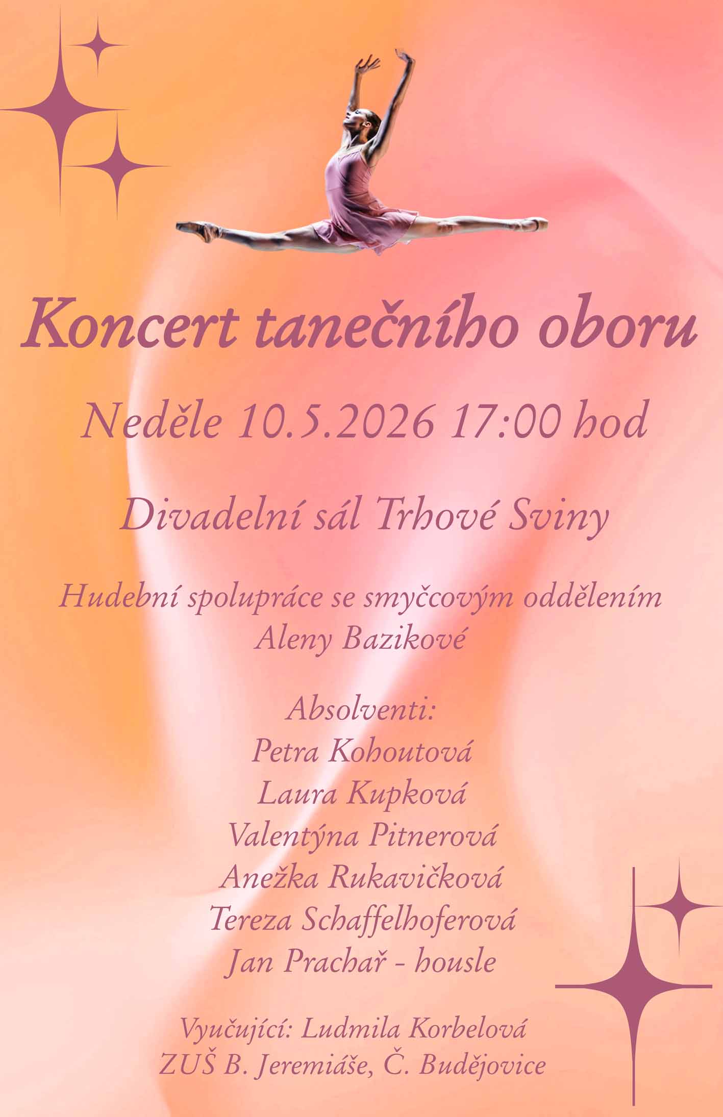 Srdečně Vás zveme na koncert tanečního oboru (třída Ludmily Korbelové), který se bude konat dne 10. 5. 2026 v divadelním sále v Trhových Svinech. Vystoupí absolventi tanečního oboru. Na koncertě spolupracuje smyčcové oddělení - třída Aleny Bazikové.